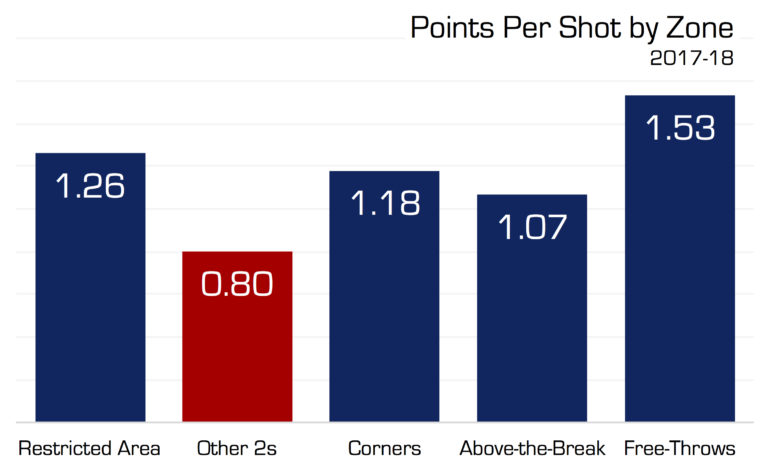 The following graph is from data on shooting is from the 2017-2018 NBA Season. (Source: Dr. Steven Shea, author of Basketball Analytics and Spatial Tracking and Basketball Analytics: Objectives and Efficient Strategies for Understanding How Teams Win)